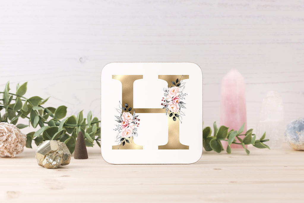 Featuring a minimalist gold initial design with floral motif, this stunning coaster matches the gold initial, metallic gold handled mug perfectly.