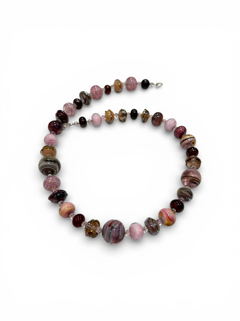 This elegant handmade necklace is crafted using high-quality glass beads made from Italian glass rods and using the ancient method of lamp working. The beads are beautifully accented with genuine Swarovski® crystals for added sparkle and sophistication. The combination of pinks, mauves and dark red shades along with silver glass swirls have been put together to create this stunning piece of jewellery. A timeless piece that catches the light with every movement.